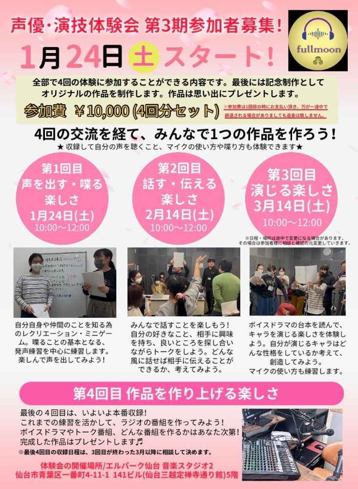 スタジオfullmoon(フルムーン)は、約20年以上にわたり、宮城県仙台市を中心に、ラジオ番組やラジオドラマを収録・制作している実績がある団体です。